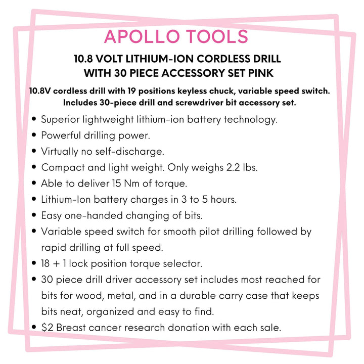 Apollo Tools, Ltd is donating $2.00 from this purchase to further breast cancer research and awareness programs. Read more about Apollo Tools' breast cancer commitment.
