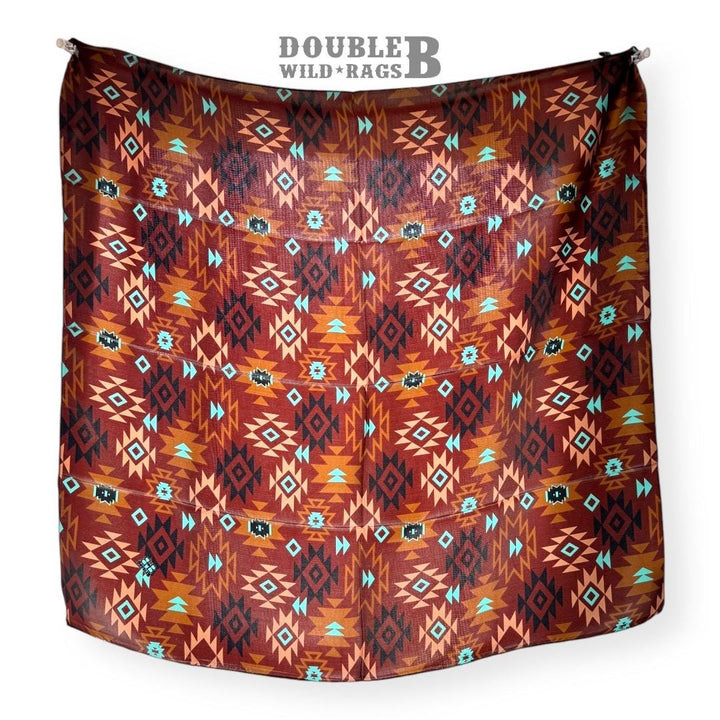 100% Silk Wild Rag Chestnut and Turquoise Aztec Native tribal inspired neck scarf by Double B Wild Rags