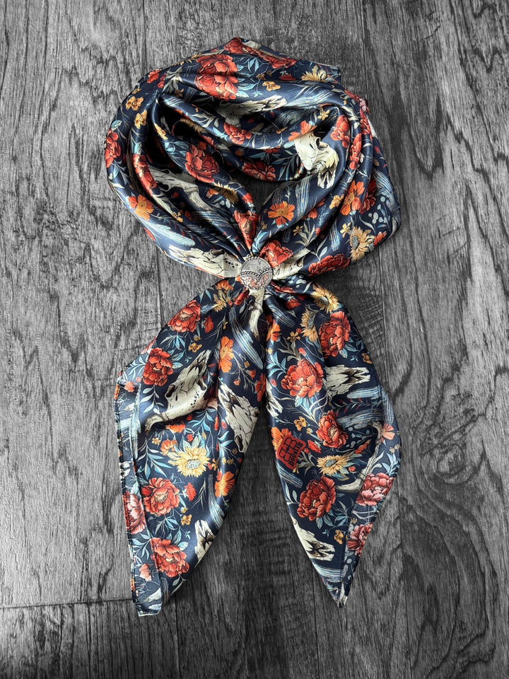 100% Silk Wild Rag Navy Blue Cow skulls and Cactus Double B Wild Rags