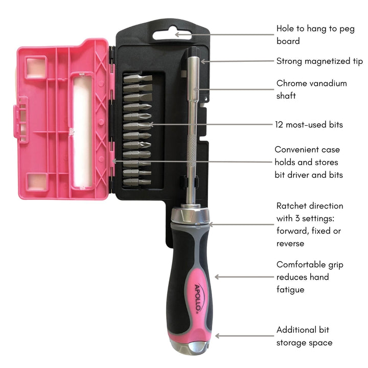 A RATCHETING SCREWDRIVER SET IN PINK. Extremely useful, a great time saver, and now in a new, beautiful pink hue, the Apollo Tools’ versatile multi-bit ratcheting screwdriver is a convenient and space-saving tool for furniture assembly, crafts, DIY, and other home maintenance and repair tasks. The ratcheting function of the bit driver makes screw-driving tasks easier. With excellent rotation control, it effortlessly switches between clockwise (fastening) and counterclockwise (loosening) ratcheting, to locking position so that it can also be used as a non-ratcheting multi-bit screwdriver). The set includes 12 bits stored in a pink and clear case, a design that keeps both the driver and bits at the ready. We’ve integrated a 6-bit holder compartment in the handle for easy access and transport. This essential ratcheting screwdriver set is a great addition to the Apollo Tools’ line of pink tools that always include a donation to the Breast Cancer Research Foundation.