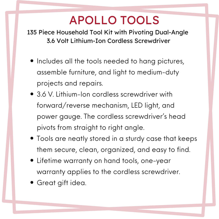 APOLLO HAND TOOL LIFETIME WARRANTY: Our hand tools are drop forged for strength; chrome plated to resist corrosion and have non-slip comfort grip handles for extra torque, and will last a lifetime under normal use. A one-year warranty applies to the cordless screwdriver.