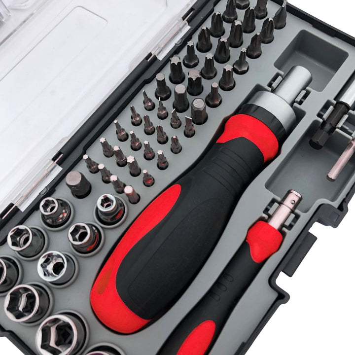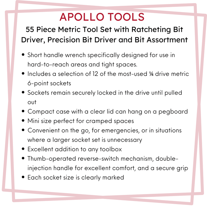 This 55 piece small and convenient metric set includes a ratcheting bit driver, a precision bit driver, and a selection of essential bits and sockets. It comes in a sturdy case with a clear lid for easy storage and transport. A great addition to any tool box, it also has a hook to attach to a peg board.
