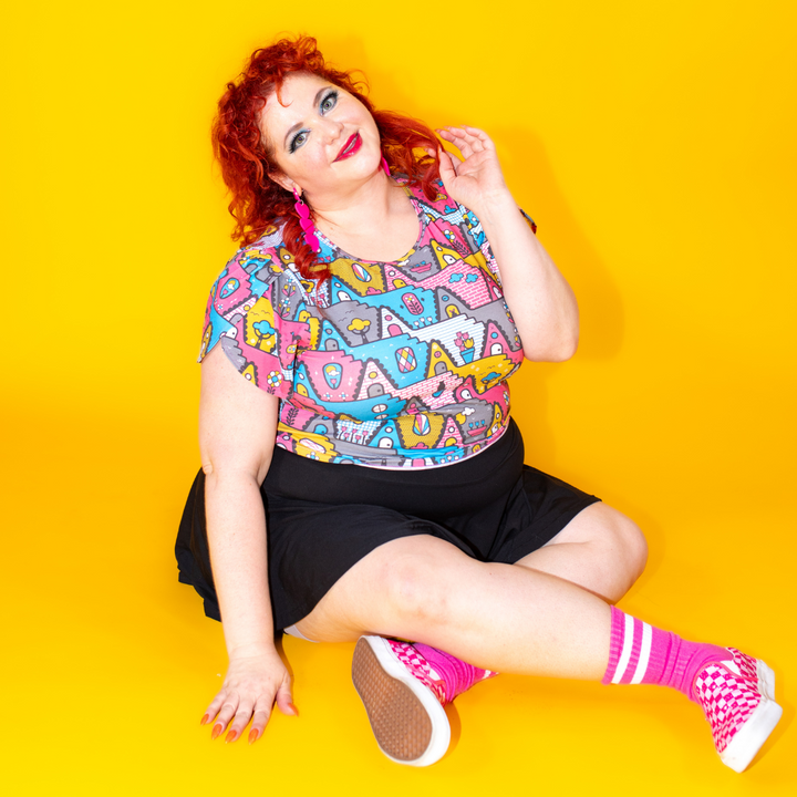 We have made our classic tulip sleeved tee in a more cropped version. This one features our bold '80s-inspired a-frame house print in a fun colorway. The little pets are the most charming part!