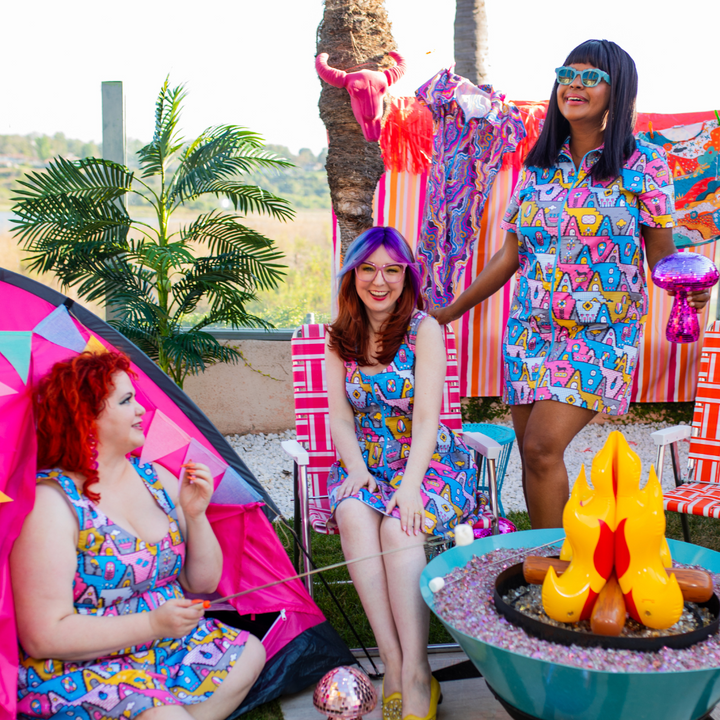 Meet our wildest fit & flare dress, made of stretch cotton poplin! Featuring our original, quirky 80s-inspired print of geometric a-frame houses, bushes and trees, and little cute pets! These scoop neck dresses feature a bright front zip, POCKETS, and a neckline that looks flattering on all body types and isn't too revealing for work or too boring for a date!