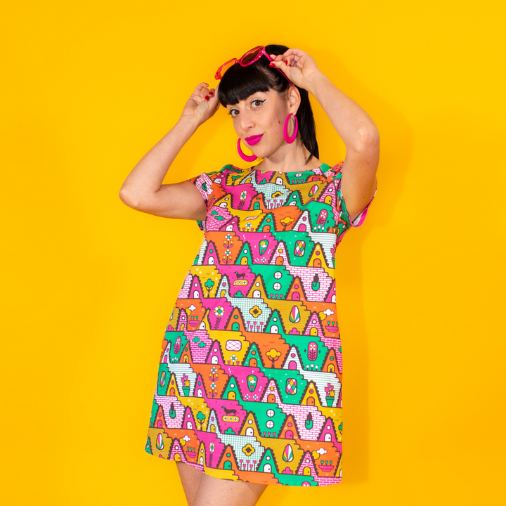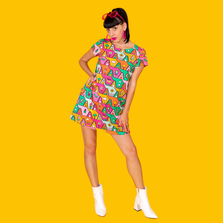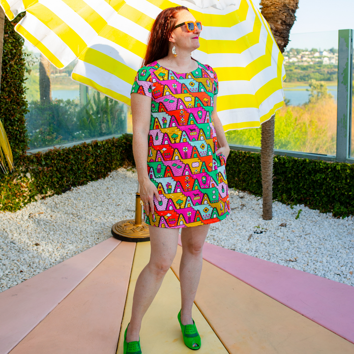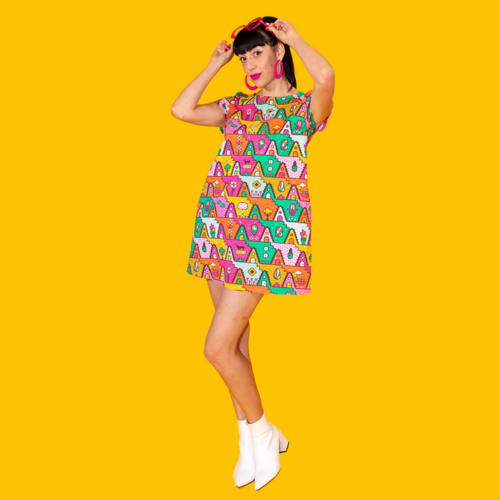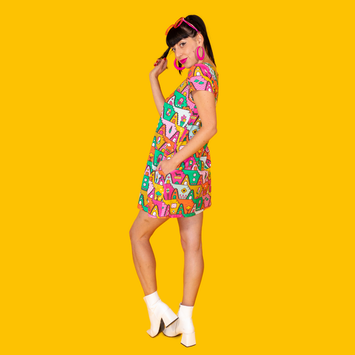 We are excited to introduce our fun a-frame house print inspired by 1980s culture adorning our a-line pocket tunic in gold green, orange, yellow and fuchsia. We promise you'll love the precious little pets in this print. Please see measurements below. Fits true to size.