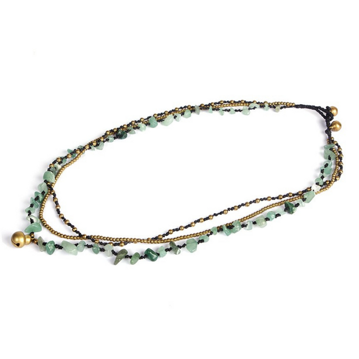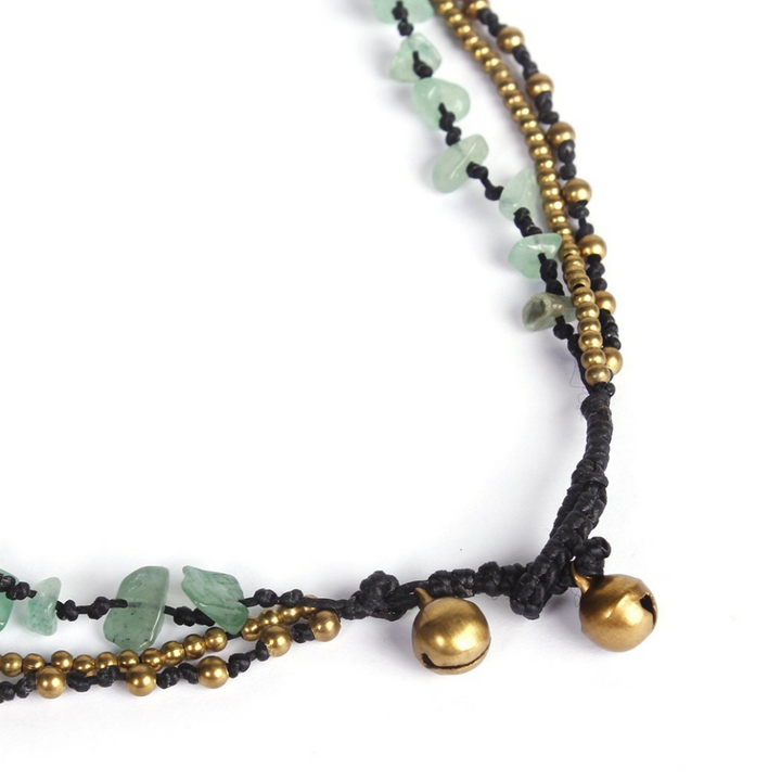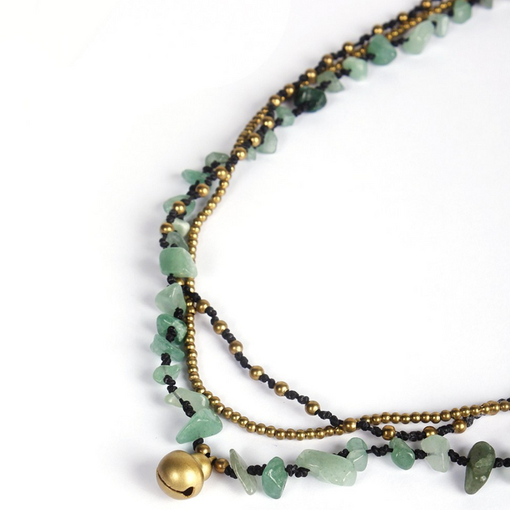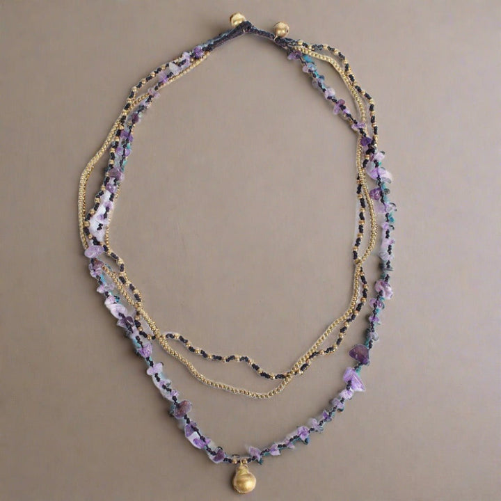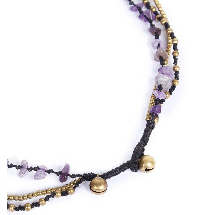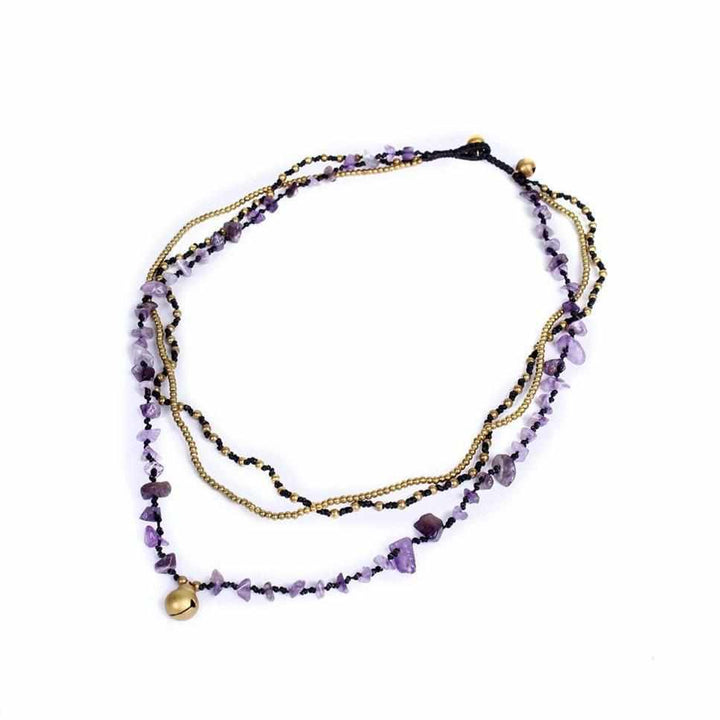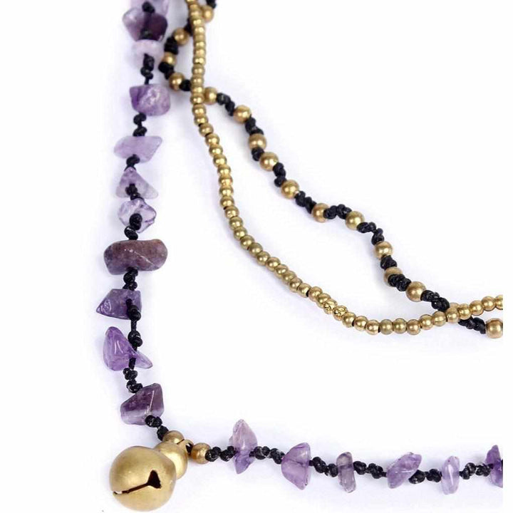 Boho style women's necklace made using amethyst chips, ethically handmade using traditional hand making techniques by female artisans in Thailand. Finished off with a beautiful brass bell at the end.