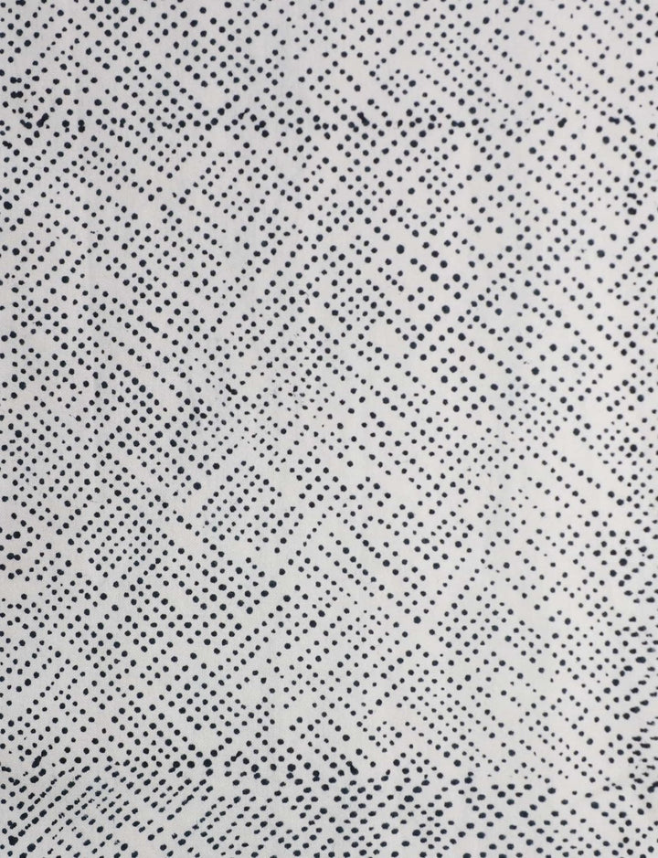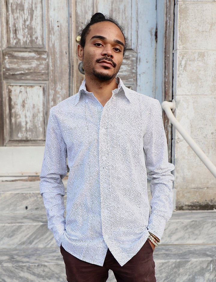A long sleeve men's button down shirt in white with a small light blue dot block print. Gentle tapering at the waist with a straight and narrow profile and a broader fit in the shoulders gives this shirt the perfect fit.