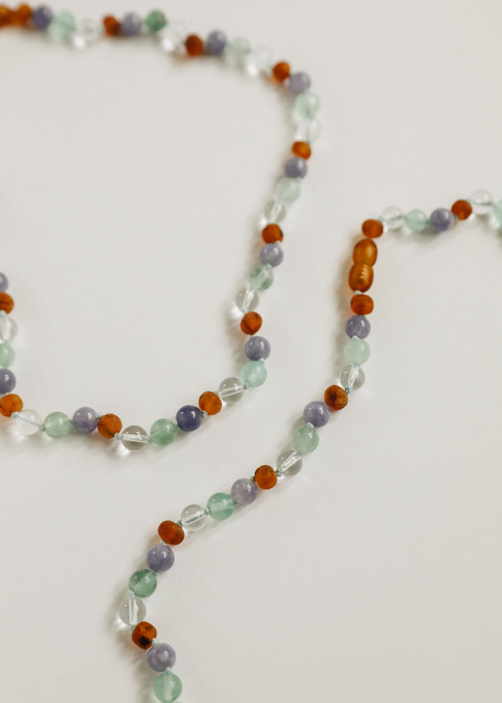 You will find Fluorite, Aquamarine, Clear Quartz and Cognac Baltic Sea Amber paired together for this special collection.