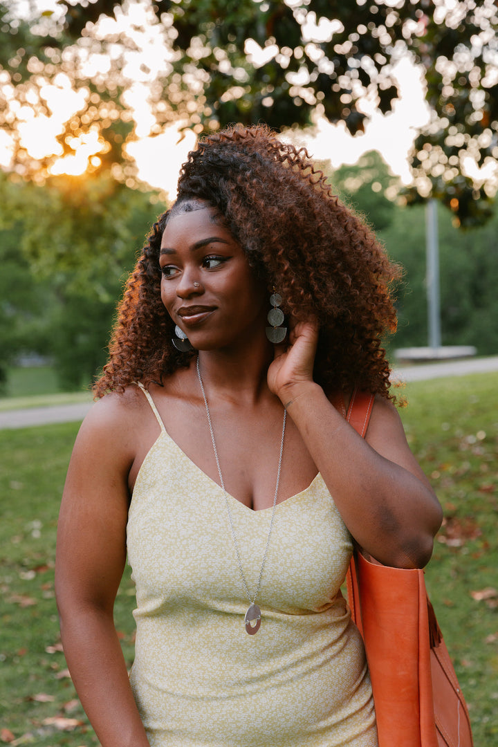 The Bateau, or “Boat” Earring: making a bold statement with its presence, just like the ladies who wear it. A gold post pairs with geometric aluminum pieces for this fresh look!