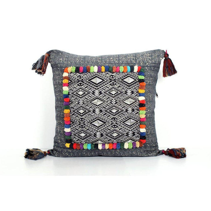 A boho style cushion, ethically handmade by our group of women artisans in Northern Thailand. It features an embroidered geometric pattern batik, adorned with multi-colored pom poms. The perfect statement piece!