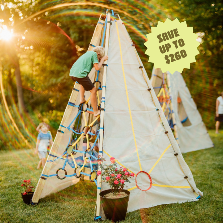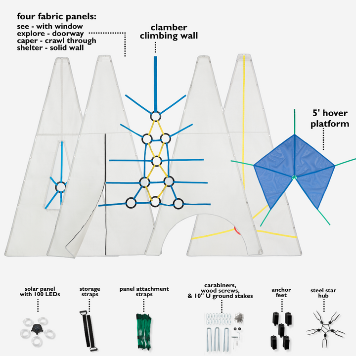 Bijou is a revolutionary collapsible play system that can quickly expand and adapt to your family's needs. It also has the strength to withstand harsh outdoor conditions, allowing it to remain up 365 days a year. It is crafted from powder-coated steel, UV-resistant recycled water bottle panels, and stainless steel hardware. It supports up to 250 lbs. and is designed for ages 3+.