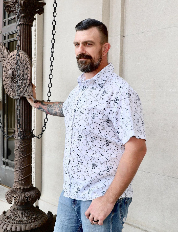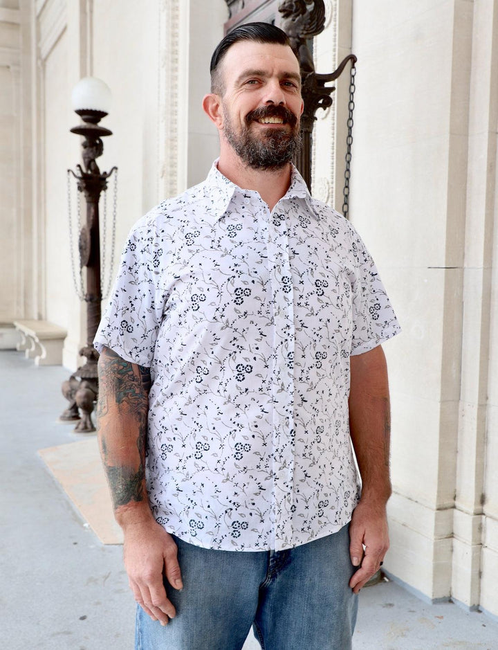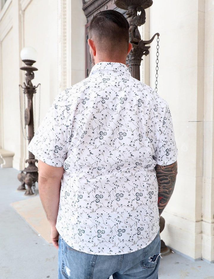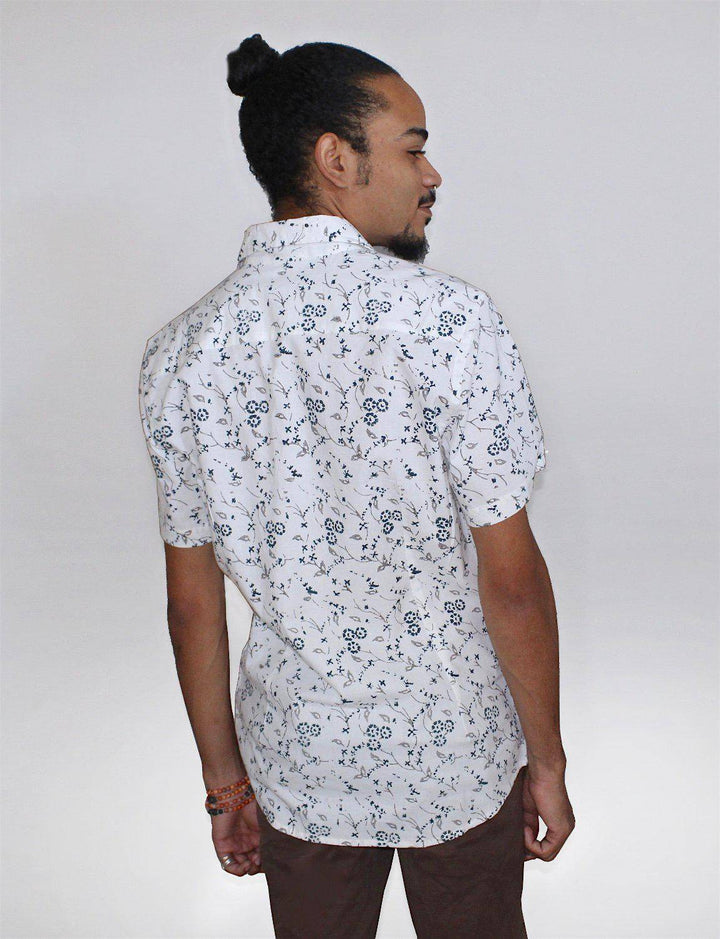 A short sleeve men's white floral button down shirt in a white and blue print on organic woven cotton. Gentle tapering at the waist with a straight and narrow profile and a broader fit in the shoulders gives this shirt the perfect fit.