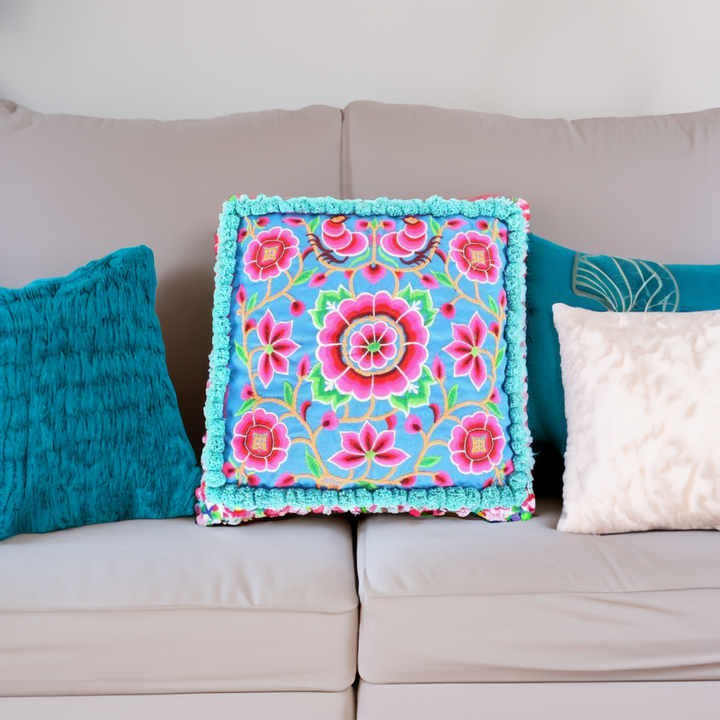 Blue Lagoon Floral Embroidered Pom Pom Cushion Cover - Thailand