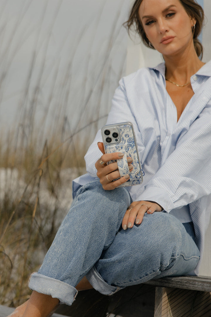 Case Design: Blue deltware floral on a white backgroundFinger Strap Color: Blue deltware floral on a white background