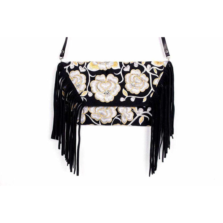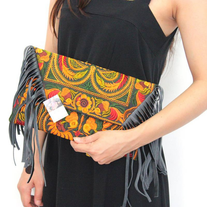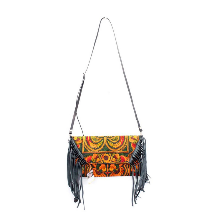 This artisan crafted crossbody bag is a sustainably made Thai handbag that features an embroidered tribal pattern black cotton lining, adorned with leather fringe. Removable straps allow for this bag to becoming a clutch!