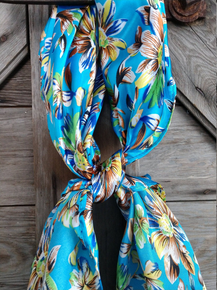 Bright Blue Wild Daisy Floral Print Cowboy Silk Charmeuse Wild Rag Western Neck Scarf Bandanna