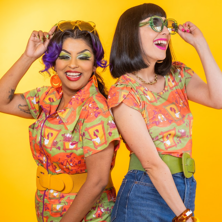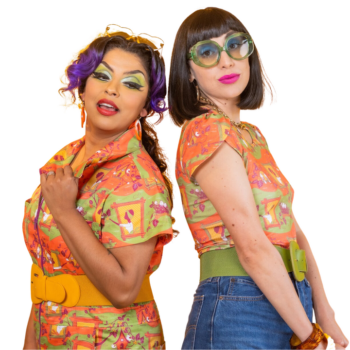 Hello! We are excited to introduce the jumpsuit featuring our unique print of darling dames silhouetted in the windows of their brownstones! This incredible piece features our best-selling exclusive print in ALL 9 SIZES in an earthy palette!