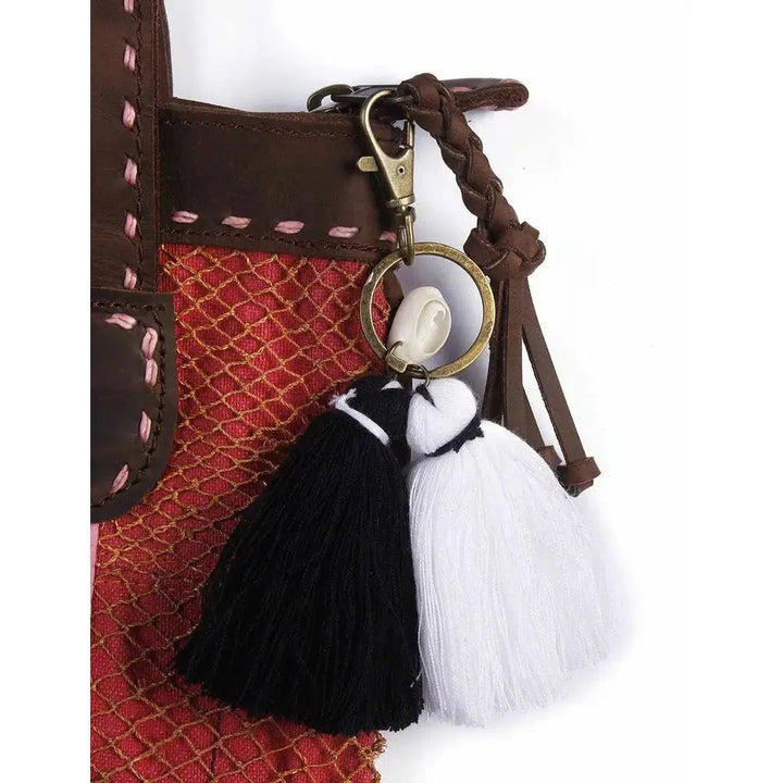 Zipper Pull- Campana is the perfect decorative accent for handbags, backpacks and hoodies. You can even use it as a key chain. Never have trouble finding your keys again! These are beautiful zipper pulls, ethically handmade by Thai Artisans that features colorful cotton, adorned with a white shell or a hoop