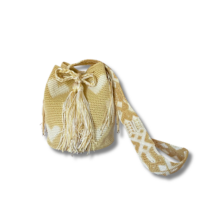 Feel the comfort of the soft crochet strap as it elegantly fits across your body, blending practicality with boho elegance. The pull-string closure ensures your essentials are secure, yet easily accessible.