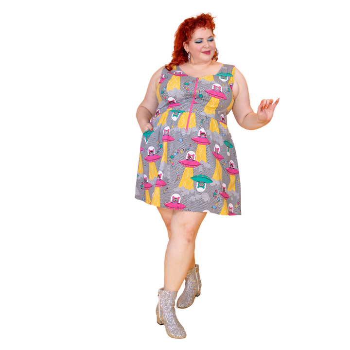 Meet our wildest fit & flare dress, made of stretch cotton poplin! Featuring our original, quirky print of cats flying around in space ships! It's a purrrfect cornucopia of color and fun! These scoop neck dresses feature a bright front zip, POCKETS, and a neckline that looks flattering on all body types and isn't too revealing for work or too boring for a date!