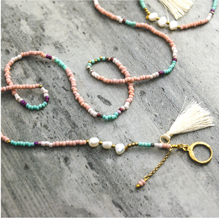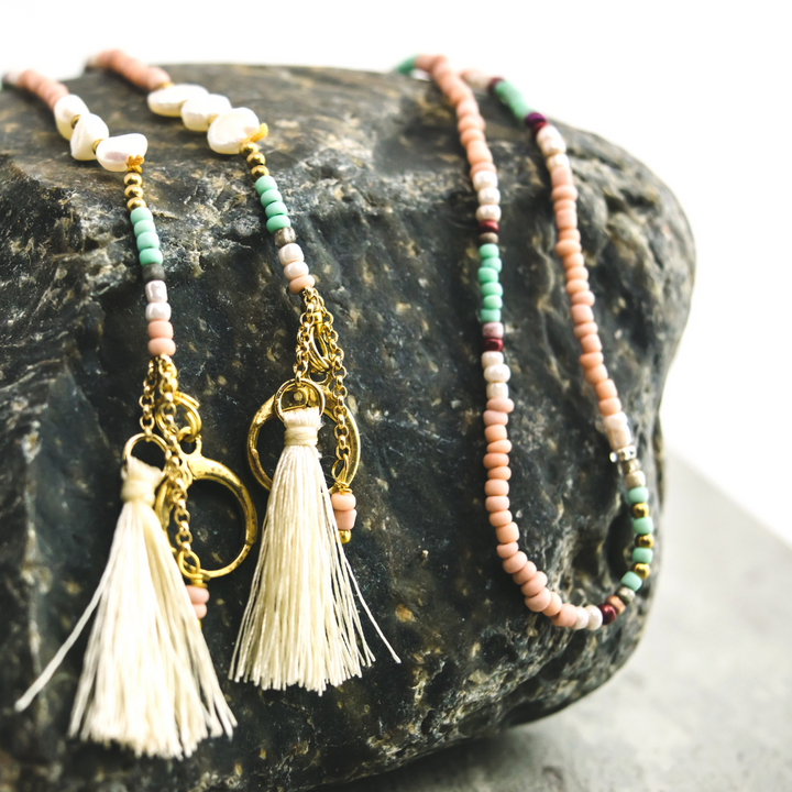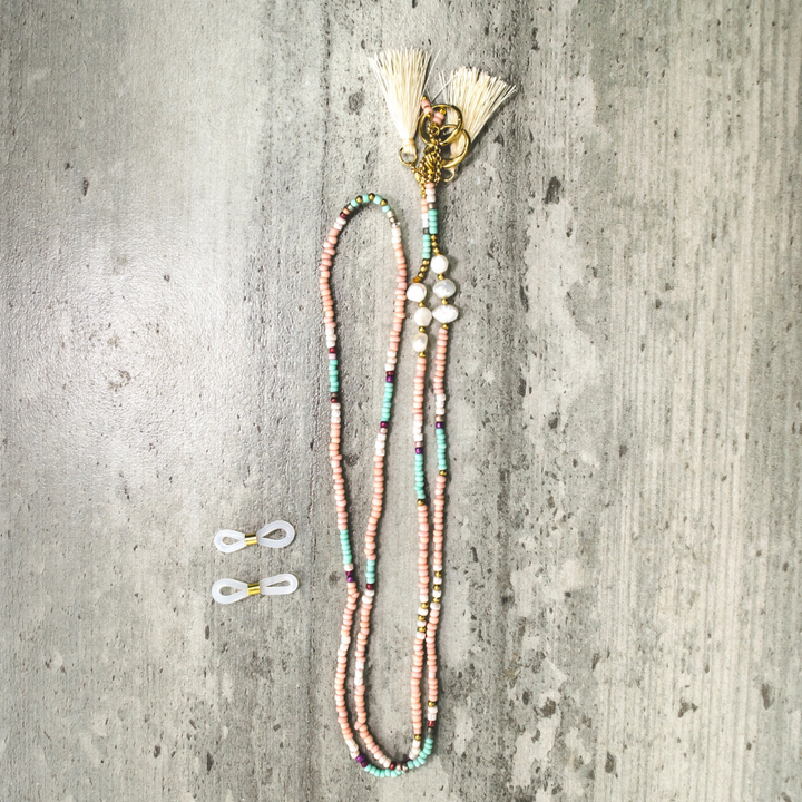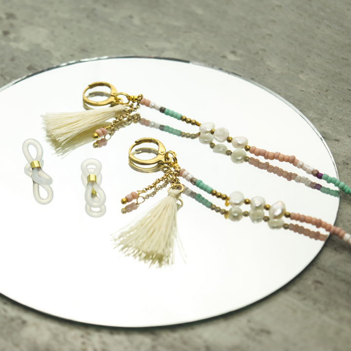 Our mask chain collection is here! Handcrafted with tiny seed beads, freshwater pearls and brass beads this mask chain doubles up as a sunglass chain! We will include a sunglass chain link with every mask that can be switched out. Finished with silk tassels and a delicate and fun chain.