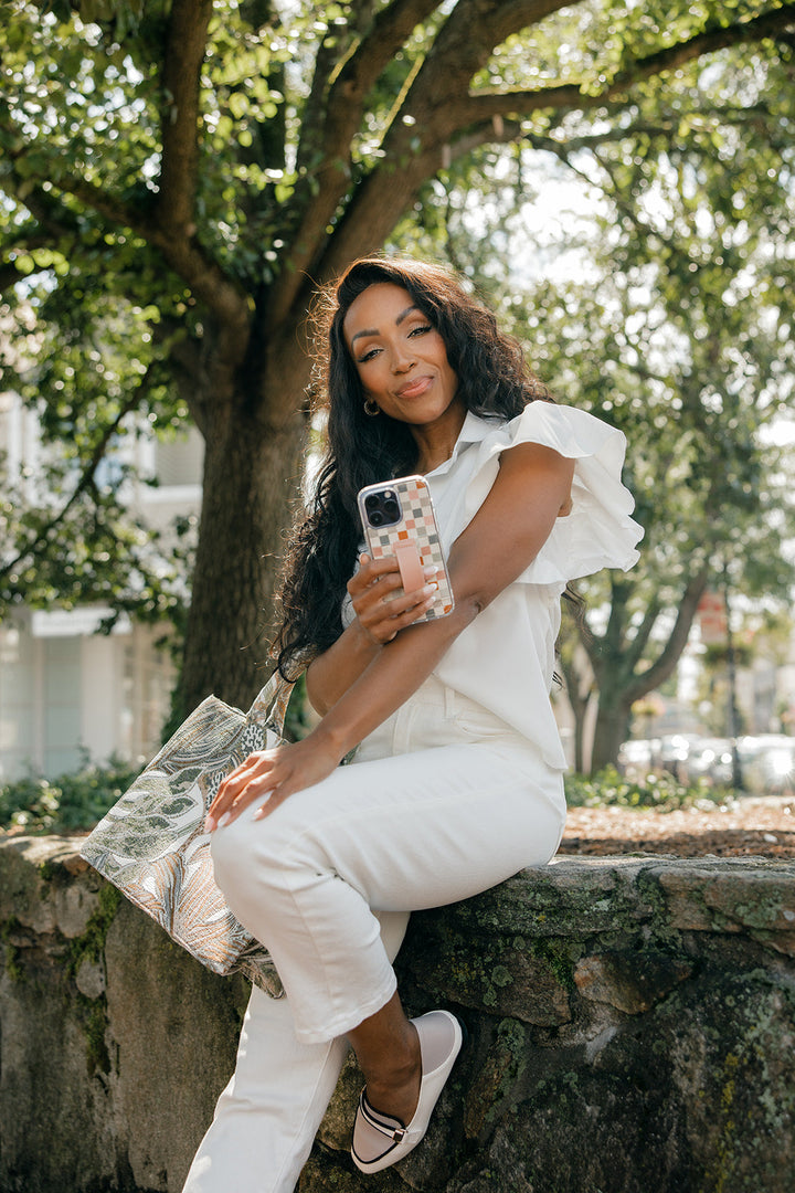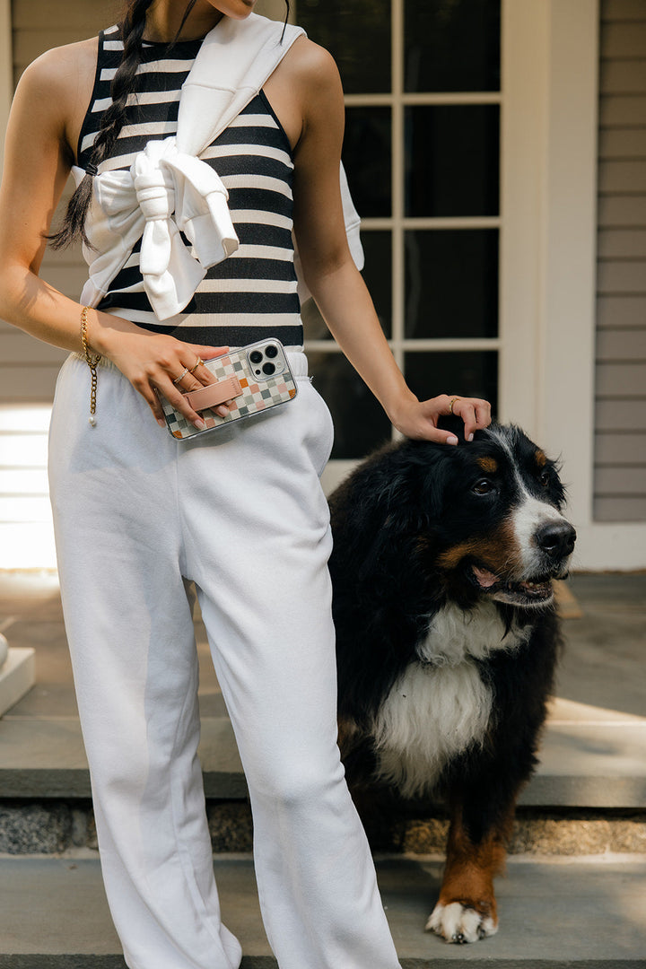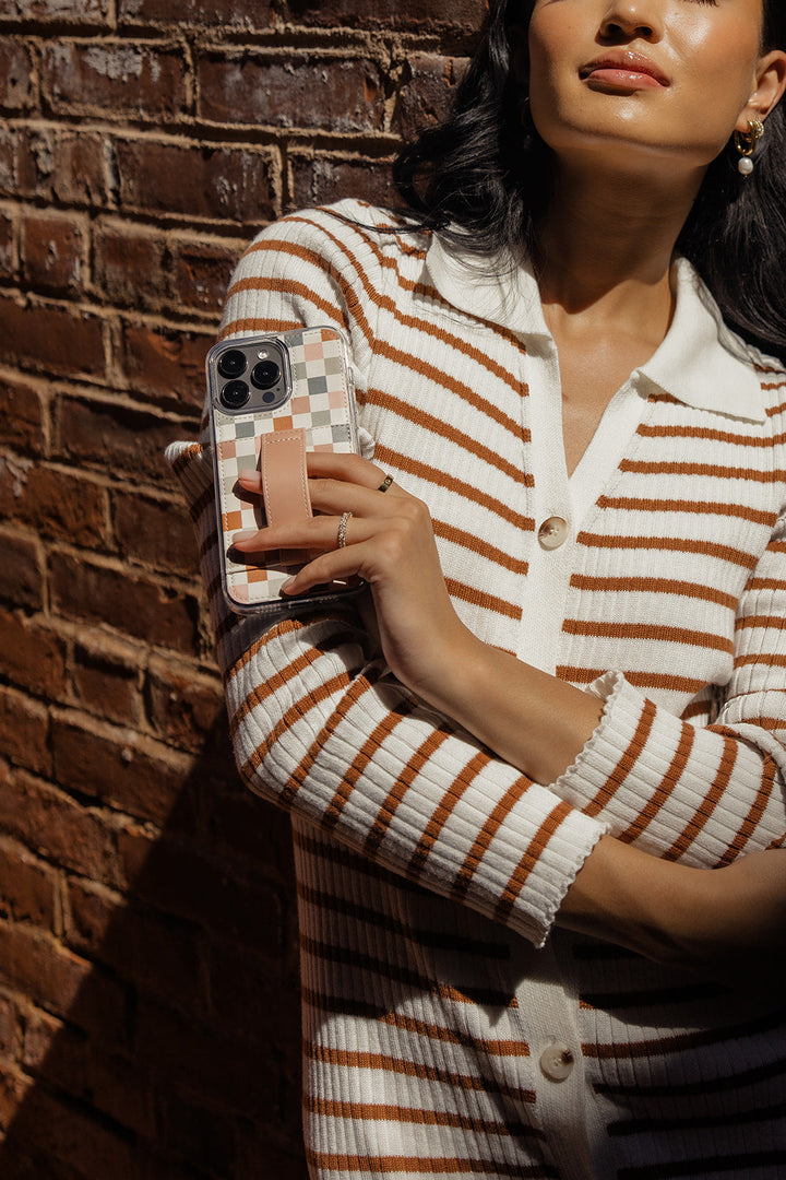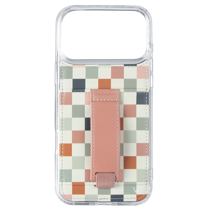 Case Design: Pink, blue, grey, and rust checker
