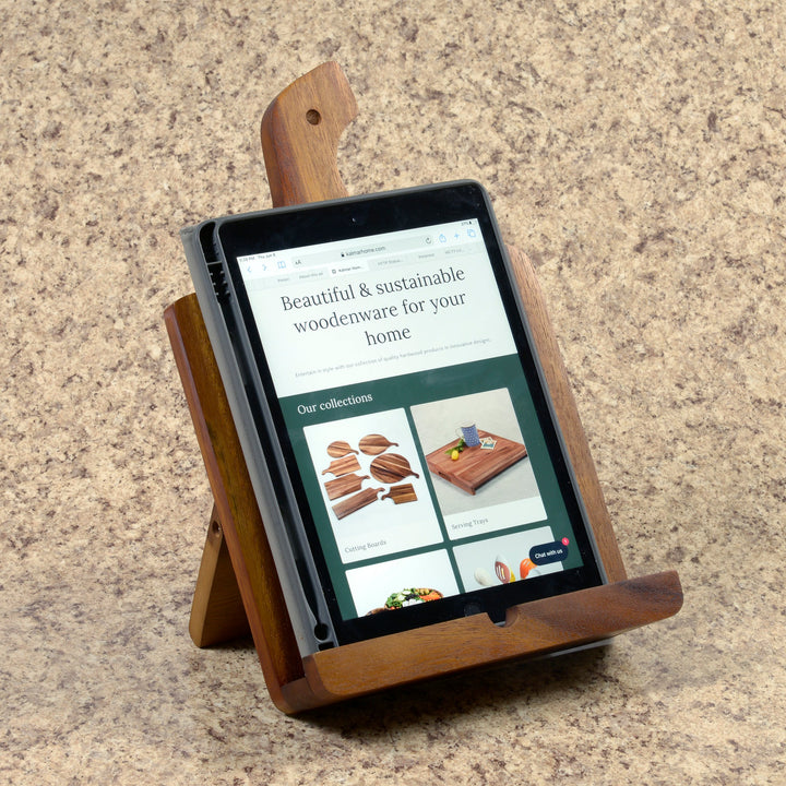 - Crafted from premium quality acacia wood, this innovative holder serves a dual purpose – it securely props up cookbooks, magazines, or recipes while also accommodating a tablet or smartphone.