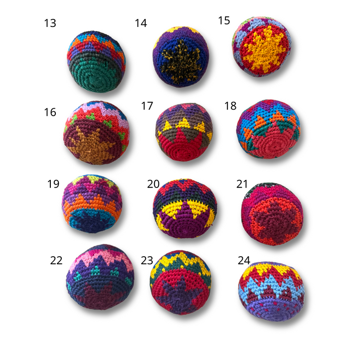 Elevate your footwork skills with our authentic, hand-crocheted Guatemalan Hacky Sack! Crafted with utmost care, each sack is tightly woven using 100% cotton for durability and lasting play. The uniqueness of every sack lies in its distinct colors and designs, ensuring a one-of-a-kind experience.