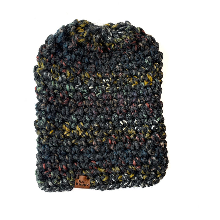 The b.e.happe simple slouch hat is handmade with 80% acrylic and 20% wool blend yarn in multi-colored gray. Be sure to spot clean or hand wash this beanie; lay flat to dry ad treat with love when necessary.