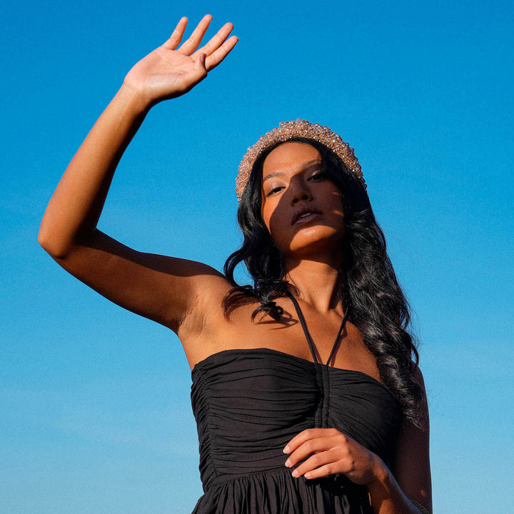 Add a touch of sparkle to your look with BrunnaCo’s dazzling CROWN Glass Headband in champagne beige color. The vibrant array of faceted glass beads catches the eye and sparkles with every movement, making it the perfect finishing touch for any special occasion.