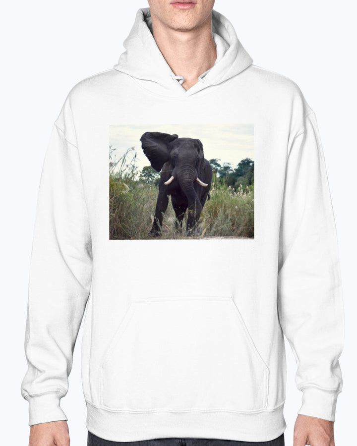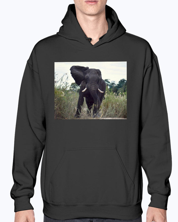 Unleash your inner power and embrace the majesty of the wild with our "MOSS, Defiant Elephant" Unisex Heavy Blend Hooded Sweatshirt. This isn't just cozy apparel; it's a profound statement, featuring a striking photograph by Robert Moss, captured in the heart of Zimbabwe. This powerful image showcases a large male African elephant, standing in a moment of pure defiance, embodying its immense size, raw strength, and unwavering spirit.