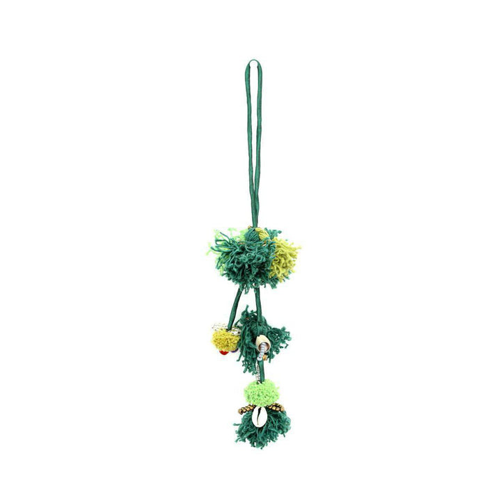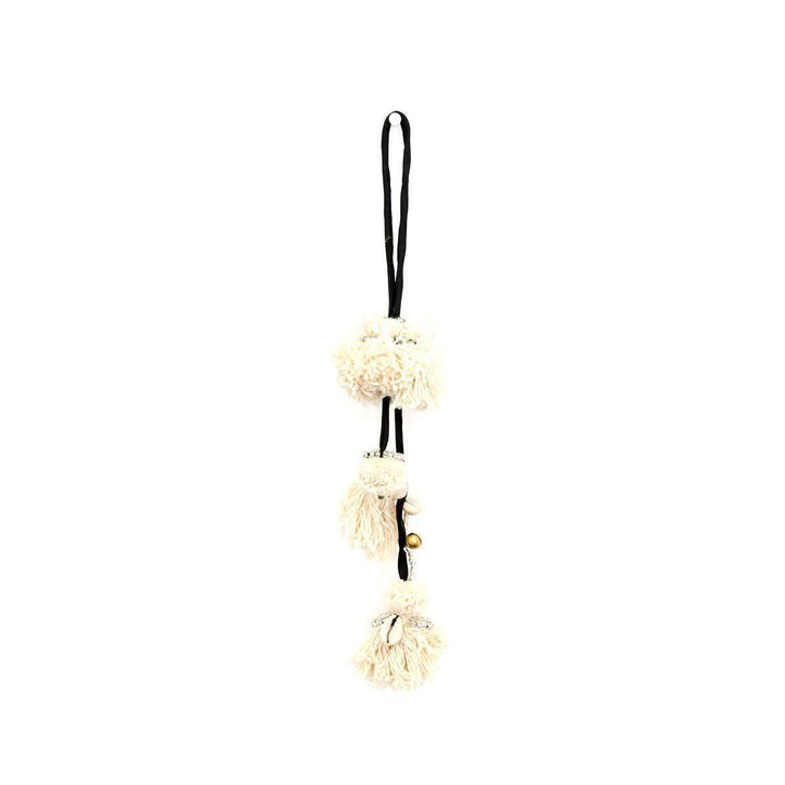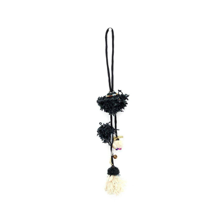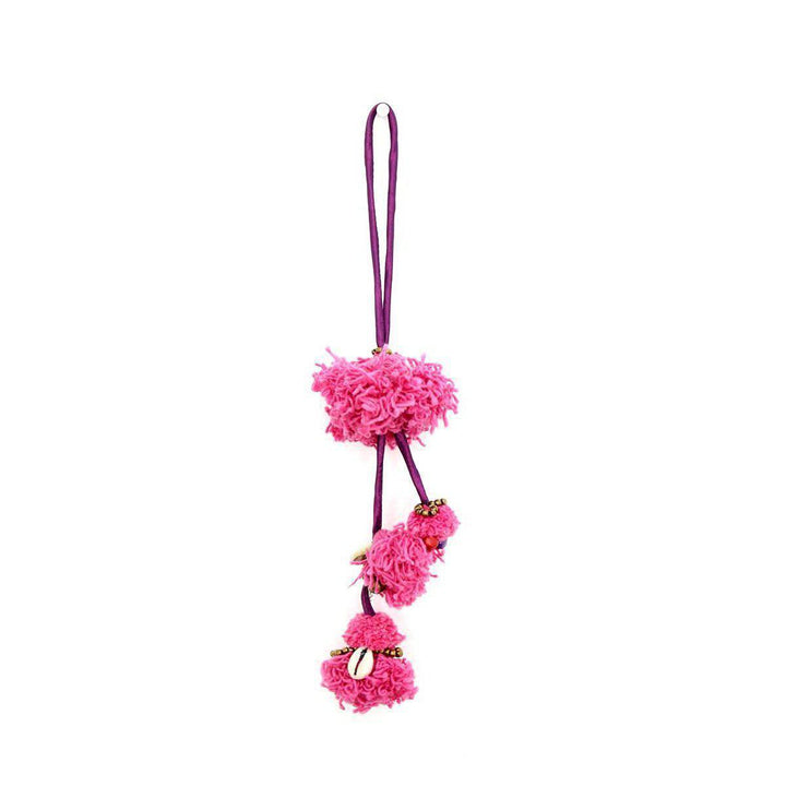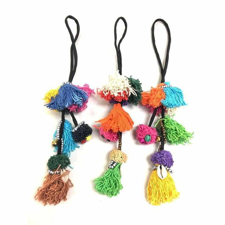 Each zipper pull features soft cotton pom poms in a mix of rich, saturated hues, accented with Czech glass beads and tiny brass bells that chime softly as you move. The loop design allows for easy tying onto any zipper, strap, or handle — making it a versatile accessory that can double as a bag charm, keychain, or decorative hanging.