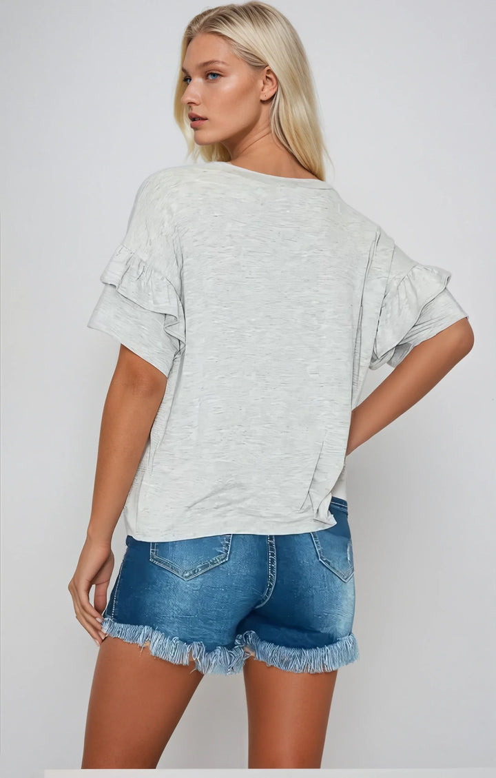 Add a touch of feminine flair to your everyday wardrobe with the Effortless Charm Ruffle Sleeve Tee. Made with a soft and breathable blend of 95% viscose and 5% spandex, this lightweight tee delivers an ultra-comfortable fit with just the right amount of stretch. The playful ruffle sleeves elevate this classic silhouette, making it perfect for dressing up or down.