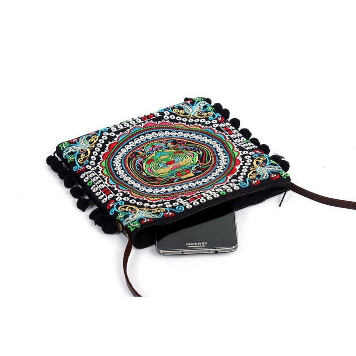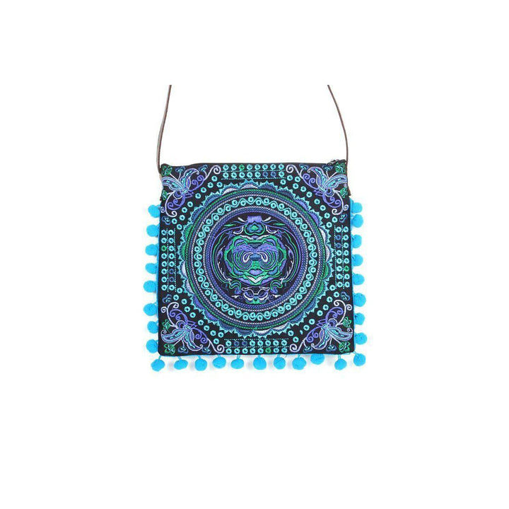 Embroidery Sling Crossbody Bag With Pompoms - Thailand