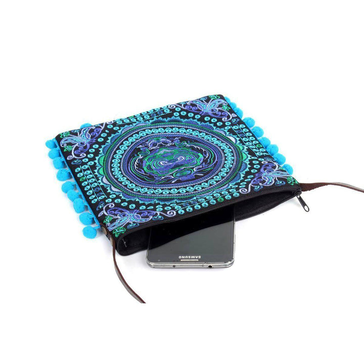 A boho style wholesale crossbody bag, handcrafted by Thai Artisans that features an embroidered butterfly pattern black cotton lining, adorned with pom pom trim.