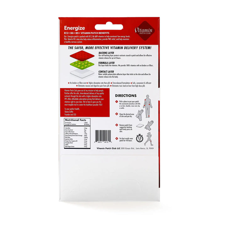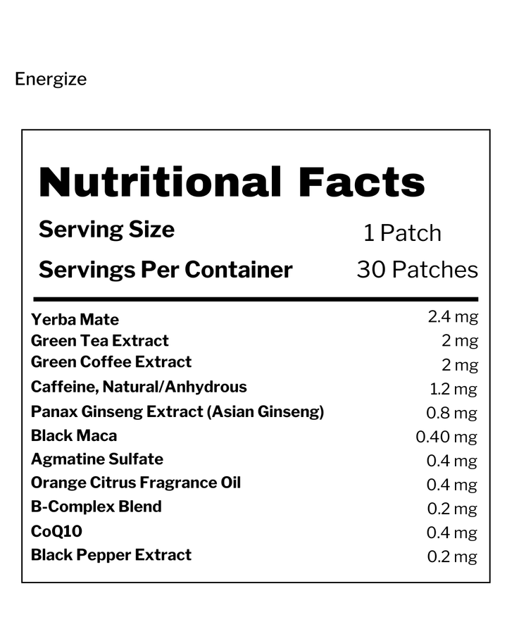 Struggling with low energy or focus? The Energize Patch delivers a clean boost to help you stay sharp and alert throughout the day. With natural caffeine from yerba mate, green tea, and green coffee extract, plus B-complex vitamins, it’s your go-to for steady, crash-free energy.