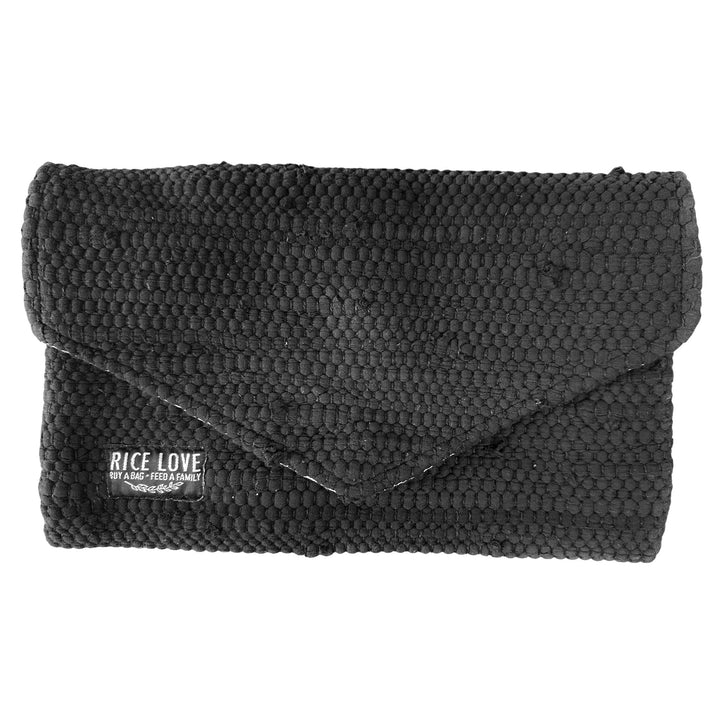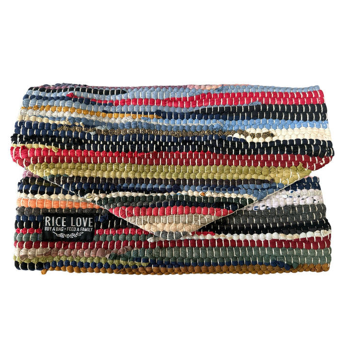 This clutch is made from Chindi fabric. 'Chindi' is a word that India's tailors use to describe waste fabric. Textile waste is upcylced and woven into a multi-colored, vibrant fabric.