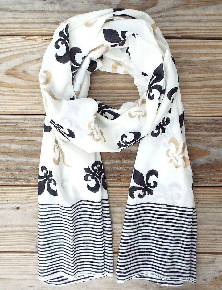 Perfect for Saints season or as a souvenir from New Orleans. A light-weight ethically made white cotton scarf with a hand stamped gold and black fleur de lis print.