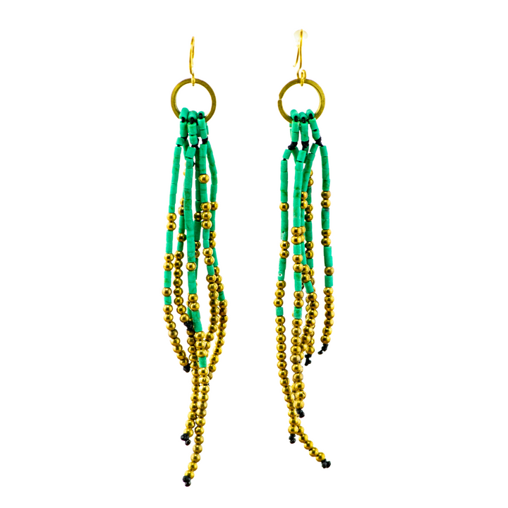 Elevate your style with these unique earrings handcrafted by artisan Kannika in the highlands of Thailand. Each pair is one-of-a-kind, made with care and following fair trade guidelines. The combination of brass hooks and jade beads creates a distinctive look that is sure to turn heads.