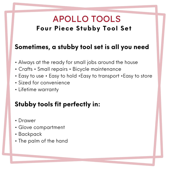 THE STURDY TOOLS YOU NEED EVERY DAY, WITHOUT THE BULK. Apollo Tools stubby toolset can be conveniently stored in small places like a kitchen drawer or glove compartment and is perfect to hang a picture frame, open a battery compartment, or for craft projects and furniture assembly.