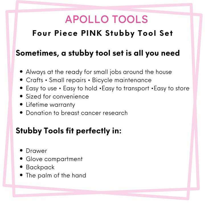 THE STURDY TOOLS YOU NEED EVERY DAY, WITHOUT THE BULK. Apollo Tools stubby toolset can be conveniently stored in small places like a kitchen drawer or glove compartment and is perfect to hang a picture frame, open a battery compartment, or for craft projects and furniture assembly.