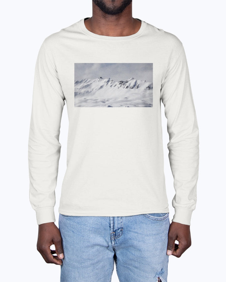 Elevate your essentials with our French Alps Mountain View premium long sleeve tee, crafted from 100% Airlume combed and ring-spun cotton for a smooth, breathable feel. This shirt offers a tailored silhouette with fitted sleeves, ribbed cuffs, and side-seamed construction for a clean, modern fit that moves with you—from trail days to city nights.
