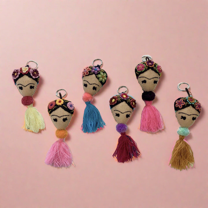 Frida has never looked so sweet and charming! This keychain/zipper pull edition in her honor is hand embroidered on colorful felt by our artisan partners in Chiapas, Mexico. Perfect as a keychain or zipper pull! Each Frida keychain has its own style, there's no twins here - they come in different bright colors and each is as beautiful as the next. Now with a lobster claw clasp!