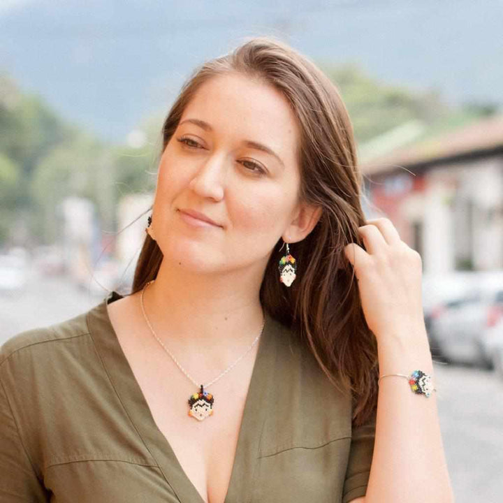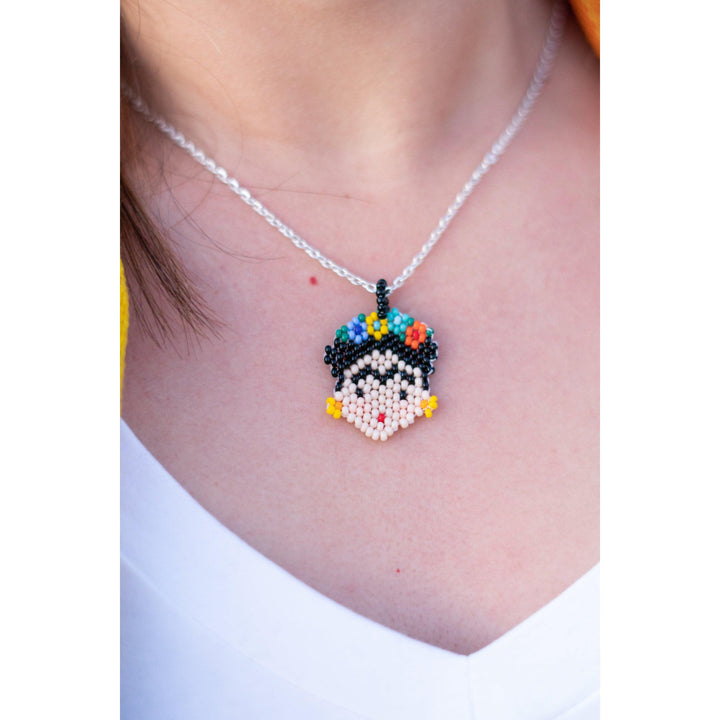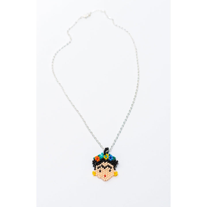 Our newest jewelry item from Mexico! Our Frida seed bead necklace is a wonderful rendition of our beloved Frida Kahlo. Hung on a 16" chain that is silver plated. Each Frida differs ever so slightly depending on the placement of the seed beads.