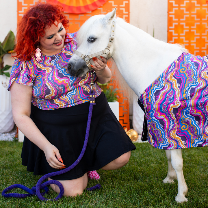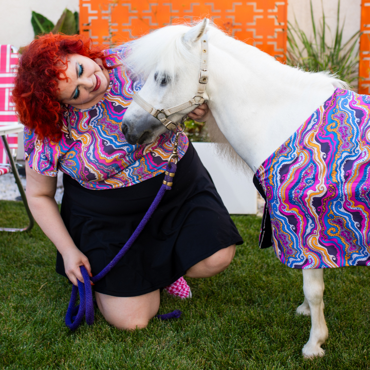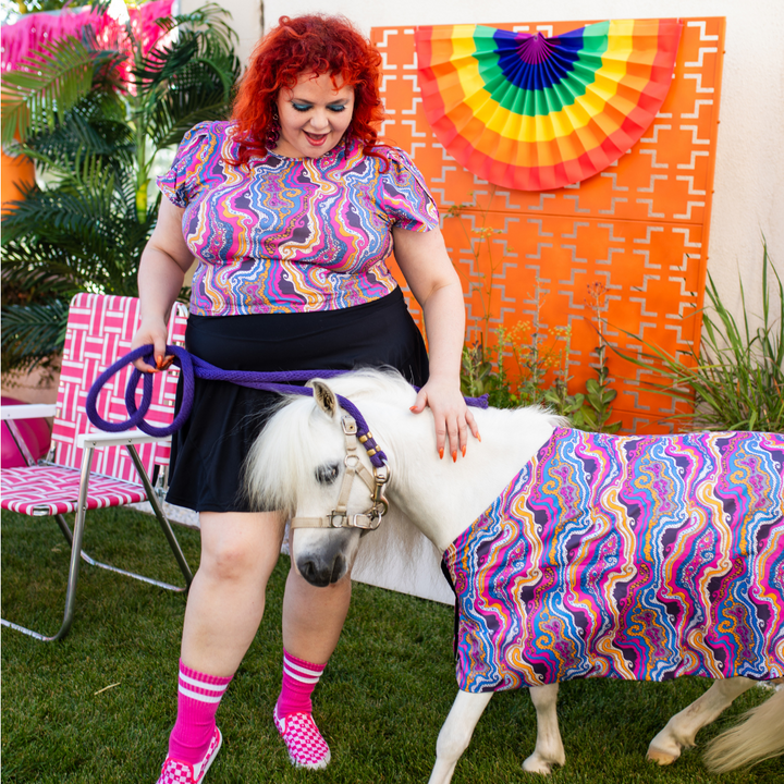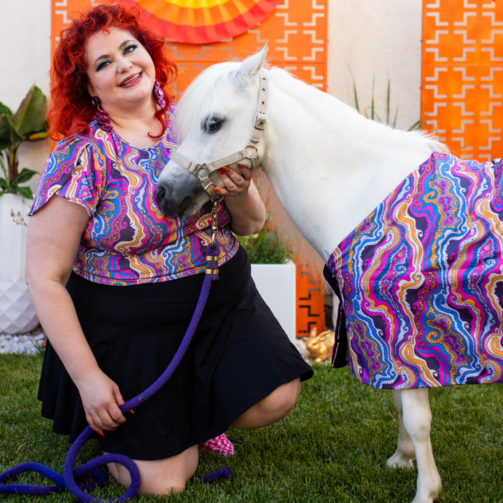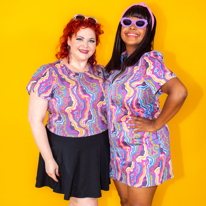 We have made our classic tulip sleeved tee in a more cropped version. This one features our brand new swirling geode print with ladies faces and wild psychedelic patterns in a tantalizing palette of purples and goldenrod.