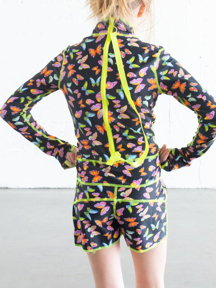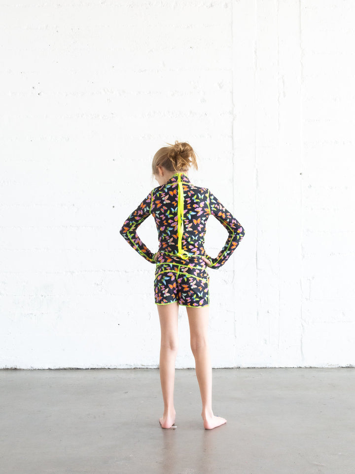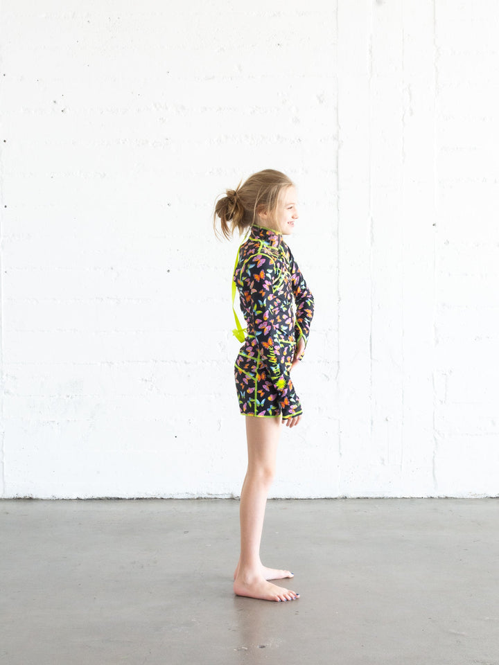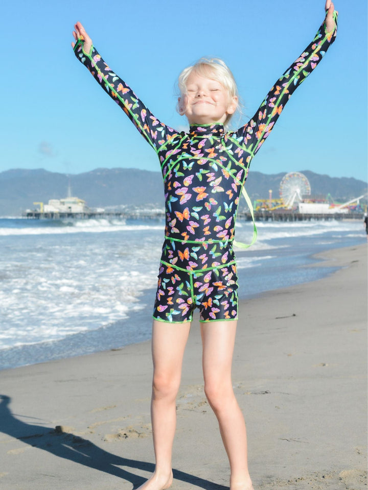 Feel stress-free this summer knowing your kids are protected from the sun! With our UPF 50+ short swimsuits, your kids will have full arm, chest, and back coverage. They also feature a high collar and thumb holes so they can safely play in the sun all day long.