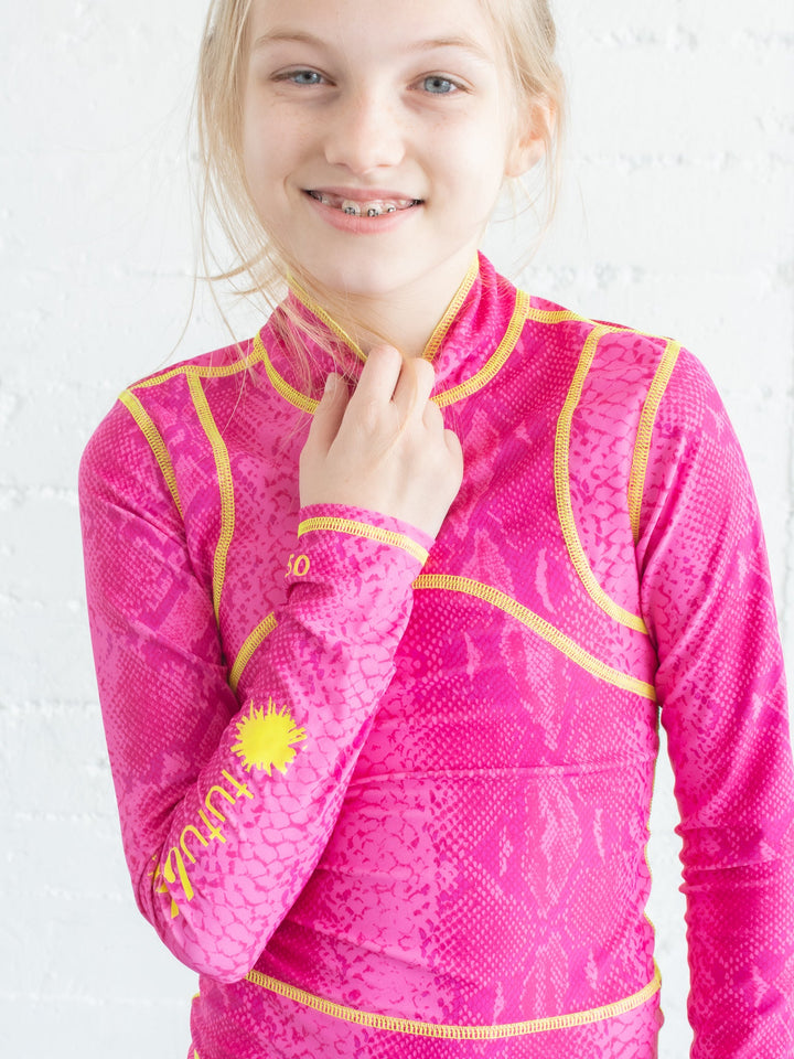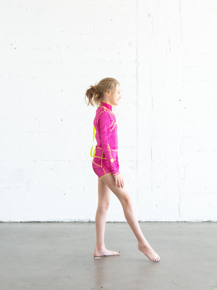Feel stress-free this summer knowing your kids are protected from the sun! With our UPF 50+ short swimsuits, your kids will have full arm, chest, and back coverage. They also feature a high collar and thumb holes so they can safely play in the sun all day long.