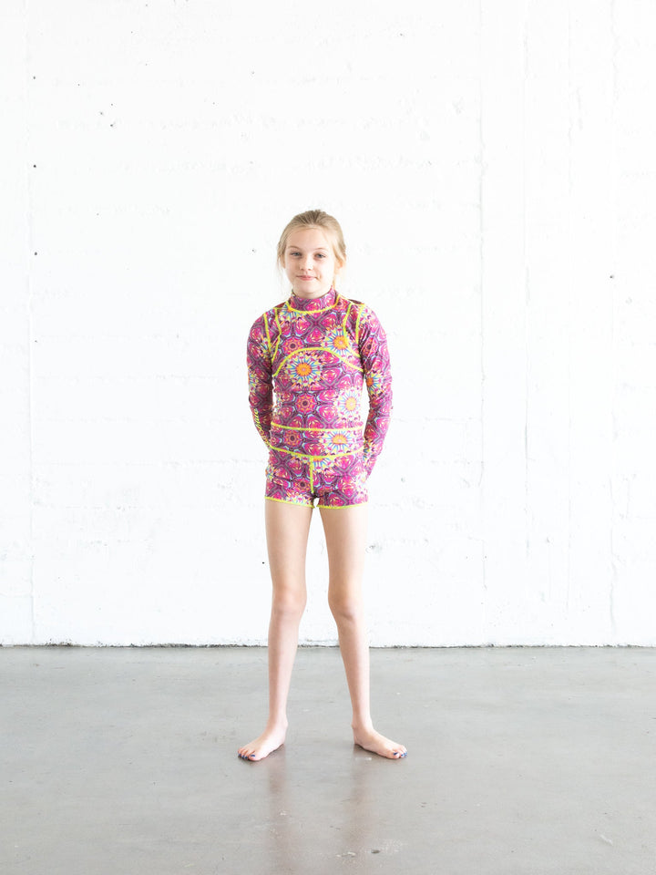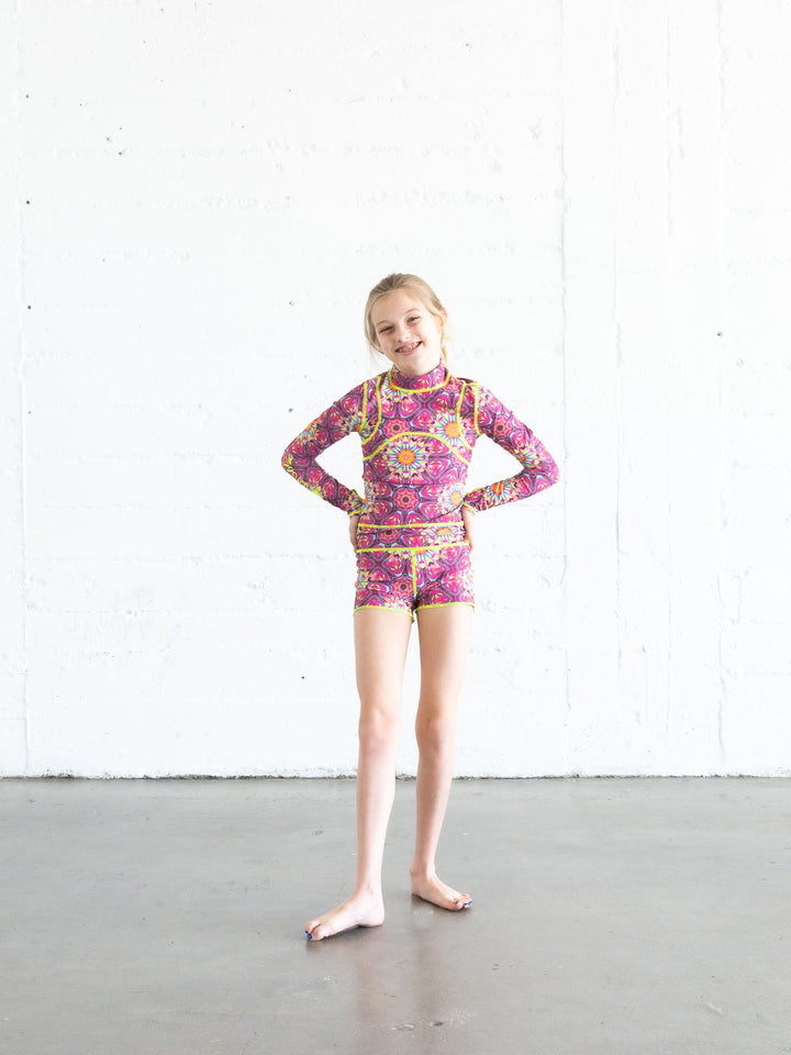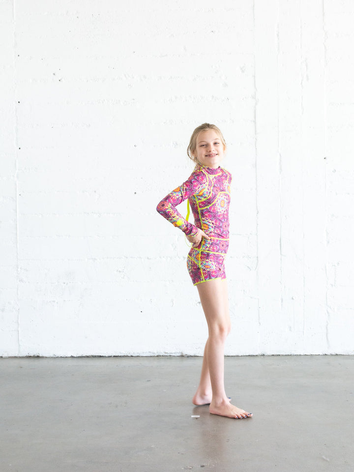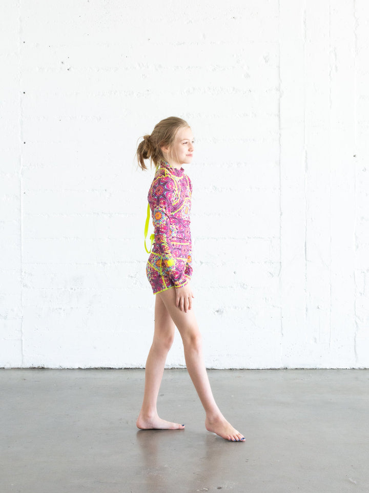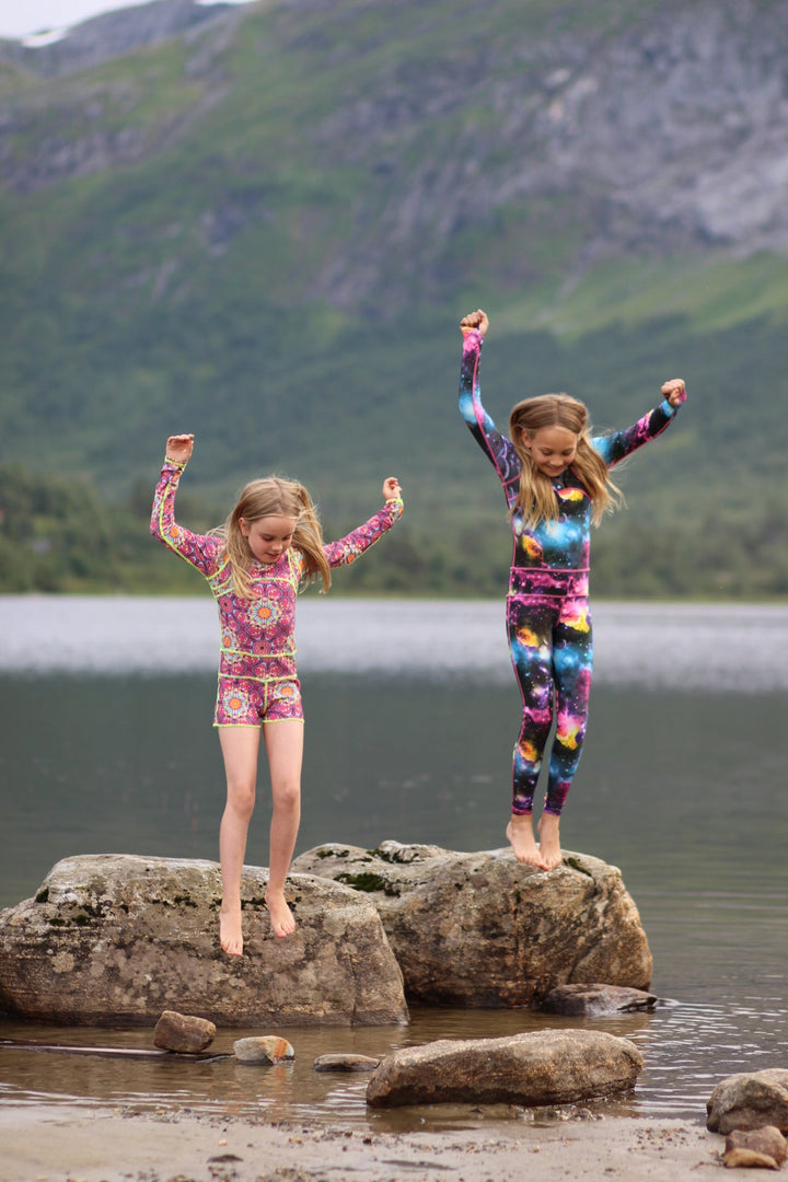 Feel stress-free this summer knowing your kids are protected from the sun! With our UPF50+ short swimsuits, your kids will have full arm, chest, and back coverage. They also feature a high collar and thumb holes so they can safely play in the sun all day long.
