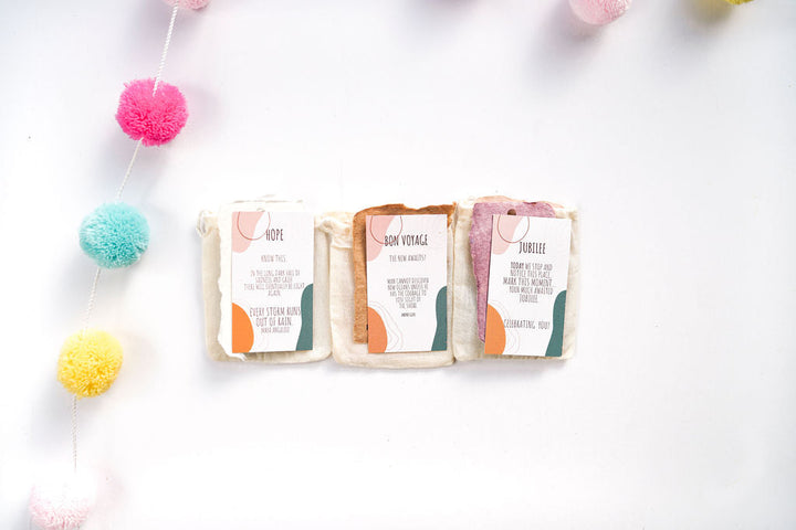 Each Angel comes in its own Drawstring Bag with the sentiment stamped on front, Inside you'll get a printed giving card, explaining the significance of the Angels and the Sentiment you choose. Angel is perched on the stamped handmade paper, which you can write on or leave blank. It's a lovely presentation...like giving a big safe hug to someone you love!