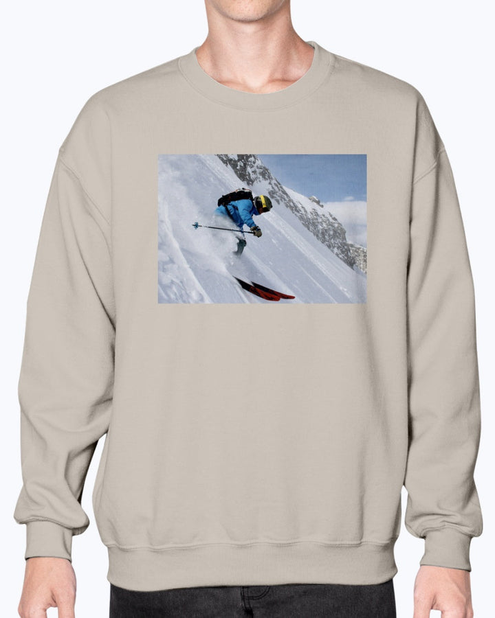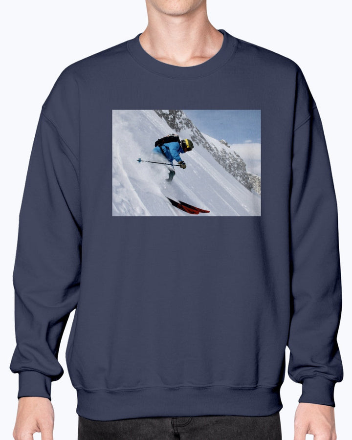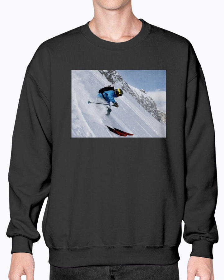 Experience the exhilarating rush of the mountains with our Unisex Heavy Blend Crewneck Sweatshirt, featuring a breathtaking photograph by Robert Moss. This isn't just cozy wear; it's a dynamic capture of a skier gracefully flying down a powdery, steep Austrian mountain – embodying the pure thrill of winter sports.